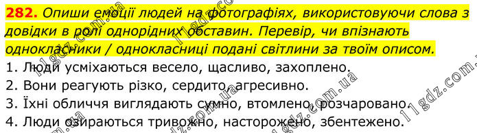 282. Опиши емоції людей на фотографіях, використовуючи слова з довідки в ролі однорідних обставин. Перевір, чи впізнають однокласники / однокласниці подані світлини за твоїм описом. 1️. Люди усміхаються весело, щасливо, захоплено. 2️. Вони реагують різко, сердито, агресивно. 3️. Їхні обличчя виглядають сумно, втомлено, розчаровано. 4️. Люди озираються тривожно, насторожено, збентежено.