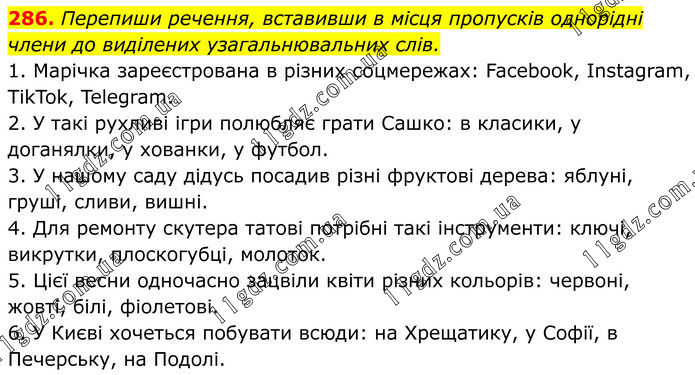 286. Перепиши речення, вставивши в місця пропусків однорідні члени до виділених узагальнювальних слів. 1. Марічка зареєстрована в різних соцмережах: Facebook, Instagram, TikTok, Telegram. 2️. У такі рухливі ігри полюбляє грати Сашко: в класики, у доганялки, у хованки, у футбол. 3️. У нашому саду дідусь посадив різні фруктові дерева: яблуні, груші, сливи, вишні. 4️. Для ремонту скутера татові потрібні такі інструменти: ключі, викрутки, плоскогубці, молоток. 5️. Цієї весни одночасно зацвіли квіти різних кольорів: червоні, жовті, білі, фіолетові. 6️. У Києві хочеться побувати всюди: на Хрещатику, у Софії, в Печерську, на Подолі.
