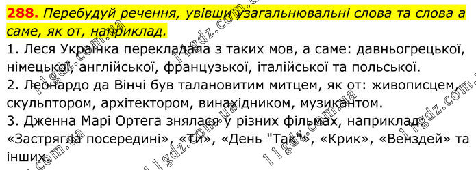 288. Перебудуй речення, увівши узагальнювальні слова та слова а саме, як от, наприклад. 1️. Леся Українка перекладала з таких мов, а саме: давньогрецької, німецької, англійської, французької, італійської та польської. 2️. Леонардо да Вінчі був талановитим митцем, як от: живописцем, скульптором, архітектором, винахідником, музикантом. 3️. Дженна Марі Ортега знялася у різних фільмах, наприклад: «Застрягла посередині», «Ти», «День "Так"», «Крик», «Венздей» та інших.