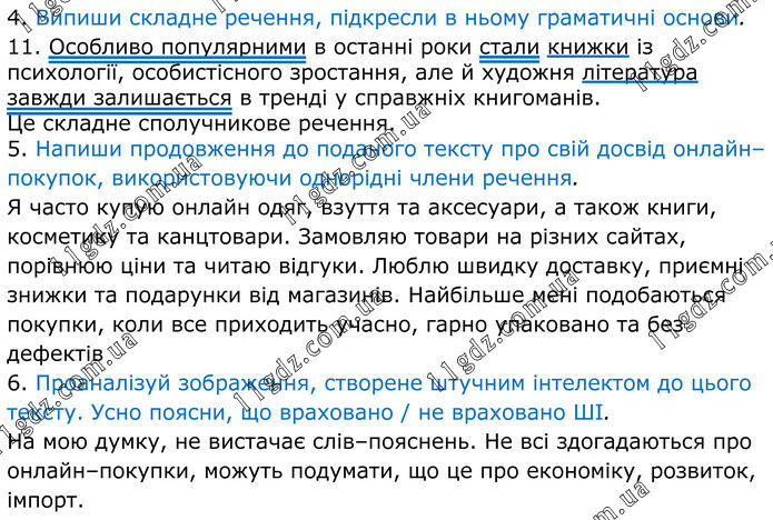 4. Випиши складне речення, підкресли в ньому граматичні основи. 11. Особливо популярними в останні роки стали книжки із психології, особистісного зростання, але й художня література завжди залишається в тренді у справжніх книгоманів. Це складне сполучникове речення. 5. Напиши продовження до поданого тексту про свій досвід онлайн– покупок, використовуючи однорідні члени речення. Я часто купую онлайн одяг, взуття та аксесуари, а також книги, косметику та канцтовари. Замовляю товари на різних сайтах, порівнюю ціни та читаю відгуки. Люблю швидку доставку, приємні знижки та подарунки від магазинів. Найбільше мені подобаються покупки, коли все приходить учасно, гарно упаковано та без дефектів 6. Проаналізуй зображення, створене штучним інтелектом до цього тексту. Усно поясни, що враховано / не враховано ШІ. На мою думку, не вистачає слів–пояснень. Не всі здогадаються про онлайн–покупки, можуть подумати, що це про економіку, розвиток, імпорт.