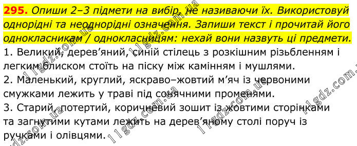 295. Опиши 2–3 підмети на вибір, не називаючи їх. Використовуй однорідні та неоднорідні означення. Запиши текст і прочитай його однокласникам / однокласницям: нехай вони назвуть ці предмети. 1. Великий, дерев’яний, синій стілець з розкішним різьбленням і легким блиском стоїть на піску між камінням і мушлями. 2. Маленький, круглий, яскраво–жовтий м’яч із червоними смужками лежить у траві під сонячними променями. 3. Старий, потертий, коричневий зошит із жовтими сторінками та загнутими кутами лежить на дерев’яному столі поруч із ручками і олівцями.