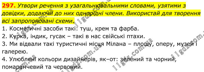 297. Утвори речення з узагальнювальними словами, узятими з довідки, додаючи до них однорідні члени. Використай для творення всі запропоновані схеми. 1. Косметичні засоби такі: туш, крем та фарба. 2. Курка, індик, гусак – такі в нас свійські птахи. 3. Ми відвали такі туристичні місця Мілана – площу, оперу, музей і галерею. 4. Улюблені кольори дизайнерів, як–от: зелений та чорний, помаранчевий та червоний.