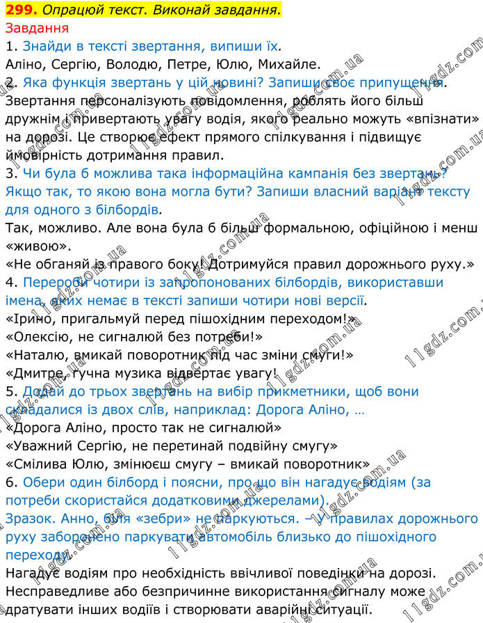 299. Опрацюй текст. Виконай завдання. Завдання 1. Знайди в тексті звертання, випиши їх. Аліно, Сергію, Володю, Петре, Юлю, Михайле. 2. Яка функція звертань у цій новині? Запиши своє припущення. Звертання персоналізують повідомлення, роблять його більш дружнім і привертають увагу водія, якого реально можуть «впізнати» на дорозі. Це створює ефект прямого спілкування і підвищує ймовірність дотримання правил. 3. Чи була б можлива така інформаційна кампанія без звертань? Якщо так, то якою вона могла бути? Запиши власний варіант тексту для одного з білбордів. Так, можливо. Але вона була б більш формальною, офіційною і менш «живою». «Не обганяй із правого боку! Дотримуйся правил дорожнього руху.» 4. Перероби чотири із запропонованих білбордів, використавши імена, яких немає в тексті запиши чотири нові версії. «Ірино, пригальмуй перед пішохідним переходом!» «Олексію, не сигналюй без потреби!» «Наталю, вмикай поворотник під час зміни смуги!» «Дмитре, гучна музика відвертає увагу! 5. Додай до трьох звертань на вибір прикметники, щоб вони складалися із двох слів, наприклад: Дорога Аліно, … «Дорога Аліно, просто так не сигналюй» «Уважний Сергію, не перетинай подвійну смугу» «Смілива Юлю, змінюєш смугу – вмикай поворотник» 6. Обери один білборд і поясни, про що він нагадує водіям (за потреби скористайся додатковими джерелами). Зразок. Анно, біля «зебри» не паркуються. – У правилах дорожнього руху заборонено паркувати автомобіль близько до пішохідного переходу. Нагадує водіям про необхідність ввічливої поведінки на дорозі. Несправедливе або безпричинне використання сигналу може дратувати інших водіїв і створювати аварійні ситуації.