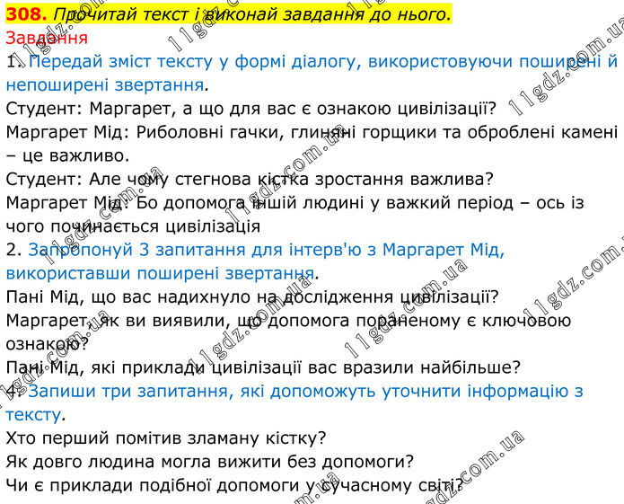 308. Прочитай текст і виконай завдання до нього. Завдання 1. Передай зміст тексту у формі діалогу, використовуючи поширені й непоширені звертання. Студент: Маргарет, а що для вас є ознакою цивілізації? Маргарет Мід: Риболовні гачки, глиняні горщики та оброблені камені – це важливо. Студент: Але чому стегнова кістка зростання важлива? Маргарет Мід: Бо допомога іншій людині у важкий період – ось із чого починається цивілізація 2. Запропонуй 3 запитання для інтерв'ю з Маргарет Мід, використавши поширені звертання. Пані Мід, що вас надихнуло на дослідження цивілізації? Маргарет, як ви виявили, що допомога пораненому є ключовою ознакою? Пані Мід, які приклади цивілізації вас вразили найбільше? 4. Запиши три запитання, які допоможуть уточнити інформацію з тексту. Хто перший помітив зламану кістку? Як довго людина могла вижити без допомоги? Чи є приклади подібної допомоги у сучасному світі?