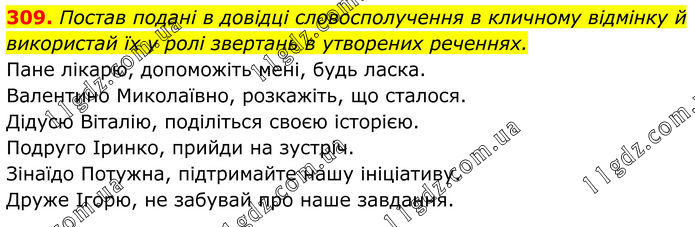 309. Постав подані в довідці словосполучення в кличному відмінку й використай їх у ролі звертань в утворених реченнях. Пане лікарю, допоможіть мені, будь ласка. Валентино Миколаївно, розкажіть, що сталося. Дідусю Віталію, поділіться своєю історією. Подруго Іринко, прийди на зустріч. Зінаїдо Потужна, підтримайте нашу ініціативу. Друже Ігорю, не забувай про наше завдання.