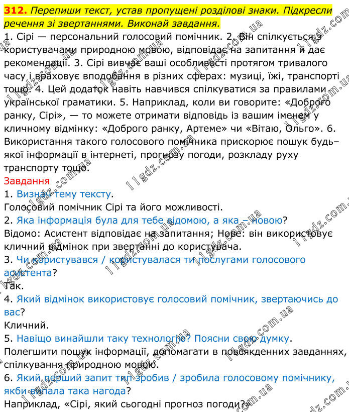 312. Перепиши текст, устав пропущені розділові знаки. Підкресли речення зі звертаннями. Виконай завдання. 1. Сірі — персональний голосовий помічник. 2. Він спілкується з користувачами природною мовою, відповідає на запитання й дає рекомендації. 3. Сірі вивчає ваші особливості протягом тривалого часу і враховує вподобання в різних сферах: музиці, їжі, транспорті тощо. 4. Цей додаток навіть навчився спілкуватися за правилами української граматики. 5. Наприклад, коли ви говорите: «Доброго ранку, Сірі», — то можете отримати відповідь із вашим іменем у кличному відмінку: «Доброго ранку, Артеме» чи «Вітаю, Ольго». 6. Використання такого голосового помічника прискорює пошук будь–якої інформації в інтернеті, прогнозу погоди, розкладу руху транспорту тощо. Завдання 1. Визнач тему тексту. Голосовий помічник Сірі та його можливості. 2. Яка інформація була для тебе відомою, а яка – новою? Відомо: Асистент відповідає на запитання; Нове: він використовує кличний відмінок при звертанні до користувача. 3. Чи користувався / користувалася ти послугами голосового асистента? Так. 4. Який відмінок використовує голосовий помічник, звертаючись до вас? Кличний. 5. Навіщо винайшли таку технологію? Поясни свою думку. Полегшити пошук інформації, допомагати в повсякденних завданнях, спілкування природною мовою. 6. Який перший запит тип зробив / зробила голосовому помічнику, якби випала така нагода? Наприклад, «Сірі, який сьогодні прогноз погоди?»