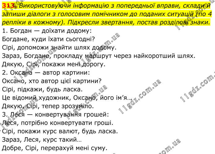 313. Використовуючи інформацію з попередньої вправи, склади й запиши діалоги з голосовим помічником до поданих ситуацій (по 4 репліки в кожному). Підкресли звертання, постав розділові знаки. 1. Богдан — доїхати додому: Богдане, куди їхати сьогодні? Сірі, допоможи знайти шлях додому. Зараз, Богдане, прокладу маршрут через найкоротший шлях. Дякую, Сірі, покажи мені дорогу. 2. Оксана — автор картини: Оксано, хто автор цієї картини? Сірі, підкажи, будь ласка. Це відомий художник, Оксано, його ім’я… Дякую, Сірі, тепер зрозуміло. 3. Леся — конвертування грошей: Леся, потрібно конвертувати гроші. Сірі, покажи курс валют, будь ласка. Зараз, Леся, курс такий… Добре, Сірі, перерахуй мені суму.