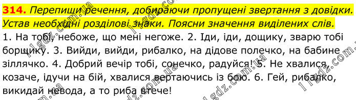 314. Перепиши речення, добираючи пропущені звертання з довідки. Устав необхідні розділові знаки. Поясни значення виділених слів. 1. На тобі, небоже, що мені негоже. 2. Іди, іди, дощику, зварю тобі борщику. 3. Вийди, вийди, рибалко, на дідове полечко, на бабине зіллячко. 4. Добрий вечір тобі, сонечко, радуйся! 5. Не хвалися, козаче, ідучи на бій, хвалися вертаючись із бою. 6. Гей, рибалко, викидай невода, а то риба втече!