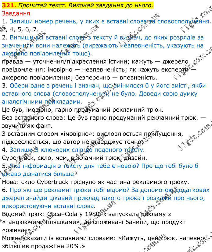 321. Прочитай текст. Виконай завдання до нього. Завдання 1. Запиши номер речень, у яких є вставні слова та словосполучення. 2, 4, 5, 6, 7. 2. Випиши всі вставні слова з тексту й визнач, до яких розрядів за значенням вони належать (виражають невпевненість, указують на джерело повідомлення тощо). правда — уточнення/підкреслення істини; кажуть — джерело повідомлення; імовірно — невпевненість; як кажуть експерти — джерело повідомлення; безперечно — впевненість. 3. Обери одне з речень і визнач, що змінилося б у його змісті, якби вставного слова (словосполучення) не було. Доведи свою думку аналогічними прикладами. Це був, імовірно, гарно продуманий рекламний трюк. Без вставного слова: Це був гарно продуманий рекламний трюк. — звучить як факт. З вставним словом «імовірно»: висловлюється припущення, підкреслюється, що автор не стверджує точно. 4. Запиши 5 ключових слів до поданого тексту. Cybertruck, скло, мем, рекламний трюк, дизайн. 5. Яка інформація з тексту для тебе є новою? Про що тобі було б цікаво дізнатися більше? Нова: скло Cybertruck тріснуло як частина рекламного трюку. 6. Про які ще рекламні трюки тобі відомо? За допомогою додаткових джерел знайди цікавий приклад такого трюка і розкажи про нього, використовуючи вставні слова. Відомий трюк: Coca–Cola у 1980–х запускала рекламу з «танцюючими пляшками», де споживачі бачили, що продукт «оживає». Можна сказати із вставними словами: «Кажуть, цей трюк, напевно, збільшив продажі на 20%.»