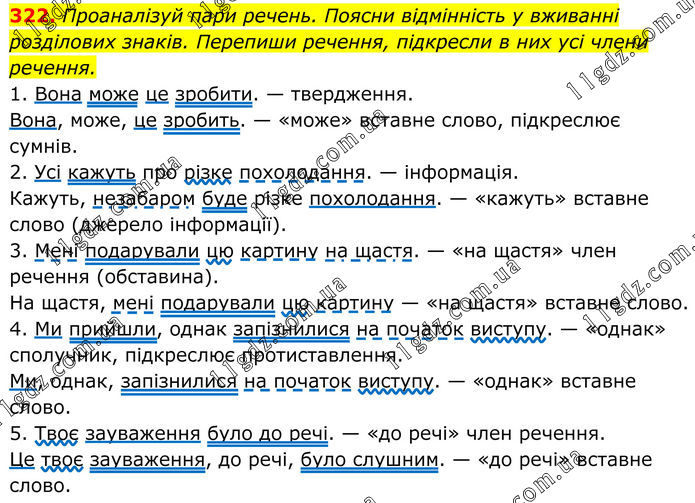 322. Проаналізуй пари речень. Поясни відмінність у вживанні розділових знаків. Перепиши речення, підкресли в них усі члени речення. 1. Вона може це зробити. — твердження. Вона, може, це зробить. — «може» вставне слово, підкреслює сумнів. 2. Усі кажуть про різке похолодання. — інформація. Кажуть, незабаром буде різке похолодання. — «кажуть» вставне слово (джерело інформації). 3. Мені подарували цю картину на щастя. — «на щастя» член речення (обставина). На щастя, мені подарували цю картину — «на щастя» вставне слово. 4. Ми прийшли, однак запізнилися на початок виступу. — «однак» сполучник, підкреслює протиставлення. Ми, однак, запізнилися на початок виступу. — «однак» вставне слово. 5. Твоє зауваження було до речі. — «до речі» член речення. Це твоє зауваження, до речі, було слушним. — «до речі» вставне слово.