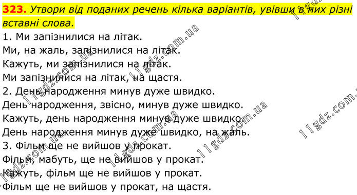 323. Утвори від поданих речень кілька варіантів, увівши в них різні вставні слова. 1. Ми запізнилися на літак. Ми, на жаль, запізнилися на літак. Кажуть, ми запізнилися на літак. Ми запізнилися на літак, на щастя. 2. День народження минув дуже швидко. День народження, звісно, минув дуже швидко. Кажуть, день народження минув дуже швидко. День народження минув дуже швидко, на жаль. 3. Фільм ще не вийшов у прокат. Фільм, мабуть, ще не вийшов у прокат. Кажуть, фільм ще не вийшов у прокат. Фільм ще не вийшов у прокат, на щастя.