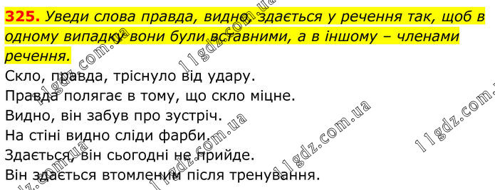 325. Уведи слова правда, видно, здається у речення так, щоб в одному випадку вони були вставними, а в іншому – членами речення. Скло, правда, тріснуло від удару. Правда полягає в тому, що скло міцне. Видно, він забув про зустріч. На стіні видно сліди фарби. Здається, він сьогодні не прийде. Він здається втомленим після тренування.