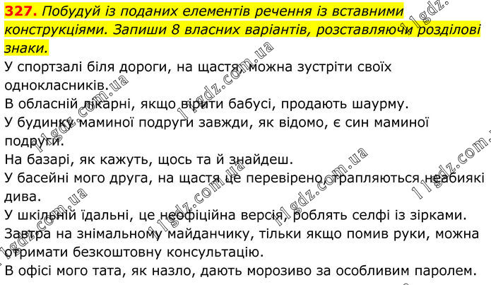 327. Побудуй із поданих елементів речення із вставними конструкціями. Запиши 8 власних варіантів, розставляючи розділові знаки. У спортзалі біля дороги, на щастя, можна зустріти своїх однокласників. В обласній лікарні, якщо вірити бабусі, продають шаурму. У будинку маминої подруги завжди, як відомо, є син маминої подруги. На базарі, як кажуть, щось та й знайдеш. У басейні мого друга, на щастя це перевірено, трапляються неабиякі дива. У шкільній їдальні, це неофіційна версія, роблять селфі із зірками. Завтра на знімальному майданчику, тільки якщо помив руки, можна отримати безкоштовну консультацію. В офісі мого тата, як назло, дають морозиво за особливим паролем.