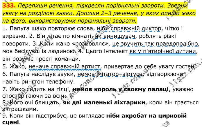 333. Перепиши речення, підкресли порівняльні звороти. Зверни увагу на розділові знаки. Допиши 2–3 речення, у яких опиши жако на фото, використовуючи порівняльні звороти. 1. Папуга шако повторює слова, ніби справжній диктор, чітко і виразно. 2. Він літає по кімнаті, як винищувач, роблять різкі повороти. 3. Коли жако «розмовляє», це звучить так правдоподібно, мов бесідуєш із людиною. 4. Цього інтелект як у п'ятирічної дитини, він розуміє прості команди. 5. Жако, неначе справжній артист, привертає до себе увагу гостей. 6. Папуга наслідує звуки, немов імітатор–віртуоз, відтворюючи навіть рингтон телефону. 7. Жако сидить на гілці, немов король у своєму палаці, уважно спостерігаючи за всім. 8. Його очі блищать, як дві маленькі ліхтарики, коли він грається з іграшками. 9. Коли він підстрибує, це виглядає ніби акробат на цирковій сцені.
