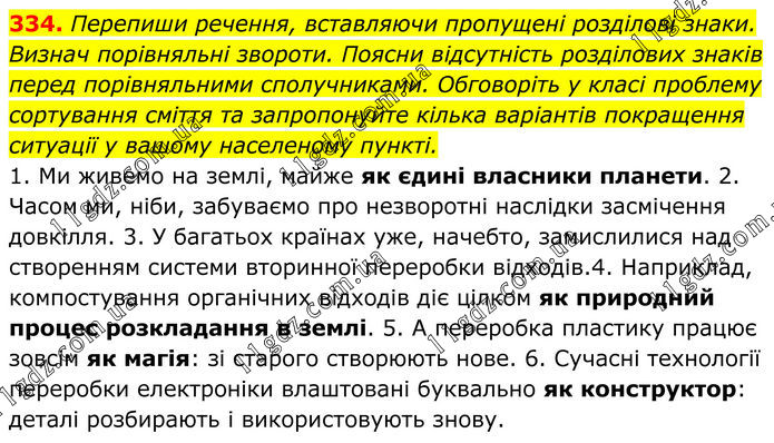 334. Перепиши речення, вставляючи пропущені розділові знаки. Визнач порівняльні звороти. Поясни відсутність розділових знаків перед порівняльними сполучниками. Обговоріть у класі проблему сортування сміття та запропонуйте кілька варіантів покращення ситуації у вашому населеному пункті. 1. Ми живемо на землі, майже як єдині власники планети. 2. Часом ми, ніби, забуваємо про незворотні наслідки засмічення довкілля. 3. У багатьох країнах уже, начебто, замислилися над створенням системи вторинної переробки відходів.4. Наприклад, компостування органічних відходів діє цілком як природний процес розкладання в землі. 5. А переробка пластику працює зовсім як магія: зі старого створюють нове. 6. Сучасні технології переробки електроніки влаштовані буквально як конструктор: деталі розбирають і використовують знову.