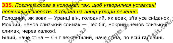 335. Поєднай слова в колонках так, щоб утворилися уставлені порівняльні звороти. З трьома на вибір утвори речення. Голодний, як вовк — Уранці він, голодний, як вовк, з'їв усе сніданок. Мокрий, немов слизький слимак — Пес біг, мокрий, немов слизький слимак, через калюжі. Білий, наче стіна — Сніг лежав білий, наче стіна, по всій галявині.