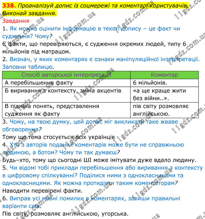 338. Проаналізуй допис із соцмережі та коментарі користувачів. Виконай завдання. Завдання 1. Як можна оцінити інформацію в тексті допису – це факт чи судження? Чому? Є факти, що перевіряються, є судження окремих людей, типу 6 мільйонів під матрацом. 2. Визнач, у яких коментарях є ознаки маніпуляційної інтерпретації. Заповни таблицю. Спосіб авторської інтерпретації Коментар А перебільшення факту 6 мільйонів. Б виривання з контексту, зміна акцентів «а ще краще жити без війни..». В підміна понять, представлення судження як факту пів світу розмовляє англійською. 3. Чому, на твою думку, цей допис міг викликати таке жваве обговорення? Тому що тема стосується всіх українців 4. Хто з авторів поданих коментарів може бути не справжньою людиною, а ботом? Чому ти так думаєш? Будь–хто, тому що сьогодні ШІ може імітувати дуже вдало людину. 5. Чи відомі тобі приклади перебільшення або виривання з контексту в цифровому спілкуванні? Поділися ними з однокласниками та однокласницями. Як можна протидіяти таким коментаторам? Наводити перевірені факти. 6. Виправ усі мовні помилки в коментарях, запиши правильні варіанти слів. Пів світу, розмовляє англійською, угорська.