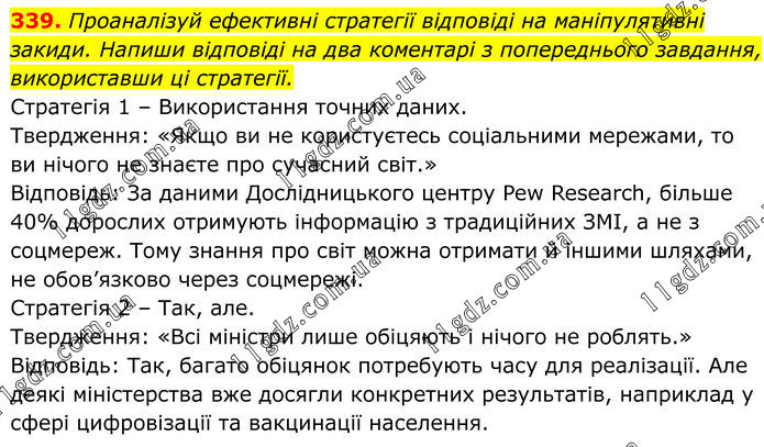 339. Проаналізуй ефективні стратегії відповіді на маніпулятивні закиди. Напиши відповіді на два коментарі з попереднього завдання, використавши ці стратегії. Стратегія 1 – Використання точних даних. Твердження: «Якщо ви не користуєтесь соціальними мережами, то ви нічого не знаєте про сучасний світ.» Відповідь: За даними Дослідницького центру Pew Research, більше 40% дорослих отримують інформацію з традиційних ЗМІ, а не з соцмереж. Тому знання про світ можна отримати й іншими шляхами, не обов’язково через соцмережі. Стратегія 2 – Так, але. Твердження: «Всі міністри лише обіцяють і нічого не роблять.» Відповідь: Так, багато обіцянок потребують часу для реалізації. Але деякі міністерства вже досягли конкретних результатів, наприклад у сфері цифровізації та вакцинації населення.