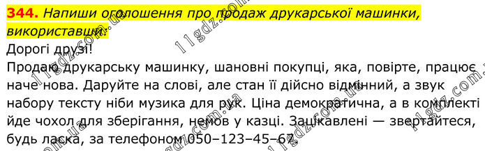 344. Напиши оголошення про продаж друкарської машинки, використавши: Дорогі друзі! Продаю друкарську машинку, шановні покупці, яка, повірте, працює наче нова. Даруйте на слові, але стан її дійсно відмінний, а звук набору тексту ніби музика для рук. Ціна демократична, а в комплекті йде чохол для зберігання, немов у казці. Зацікавлені — звертайтеся, будь ласка, за телефоном 050–123–45–67.