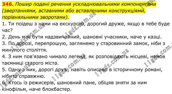 346. Пошир подані речення ускладнювальними компонентами (звертаннями, вставними або вставленими конструкціями, порівняльними зворотами). 1. Ти поїдеш з нами на екскурсію, дорогий друже, якщо в тебе буде час? 2. День має бути надзвичайний, шановні учасники, наче у казці. 3. По дорозі, перепрошую, заглянемо у старовинний замок, ніби з минулого століття. 4. З ним пов’язано чимало легенд, як розповідають місцеві, немов таємниці старого міста. 5. Одну з них, дорогі друзі, навіть описано в історичному романі, нібито справжню. 6. Хтось із режисерів, шановний пане, обіцяв зняти за ним кінофільм, наче блокбастер.