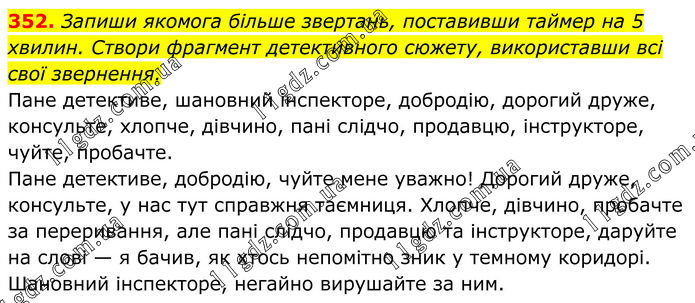 352. Запиши якомога більше звертань, поставивши таймер на 5 хвилин. Створи фрагмент детективного сюжету, використавши всі свої звернення. Пане детективе, шановний інспекторе, добродію, дорогий друже, консульте, хлопче, дівчино, пані слідчо, продавцю, інструкторе, чуйте, пробачте. Пане детективе, добродію, чуйте мене уважно! Дорогий друже, консульте, у нас тут справжня таємниця. Хлопче, дівчино, пробачте за переривання, але пані слідчо, продавцю та інструкторе, даруйте на слові — я бачив, як хтось непомітно зник у темному коридорі. Шановний інспекторе, негайно вирушайте за ним.