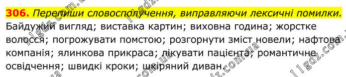 306. Перепиши словосполучення, виправляючи лексичні помилки. Байдужий вигляд; виставка картин; виховна година; жорстке волосся; погрожувати помстою; розгорнути зміст новели; нафтова компанія; ялинкова прикраса; лікувати пацієнта; романтичне освідчення; швидкі кроки; шкіряний диван.