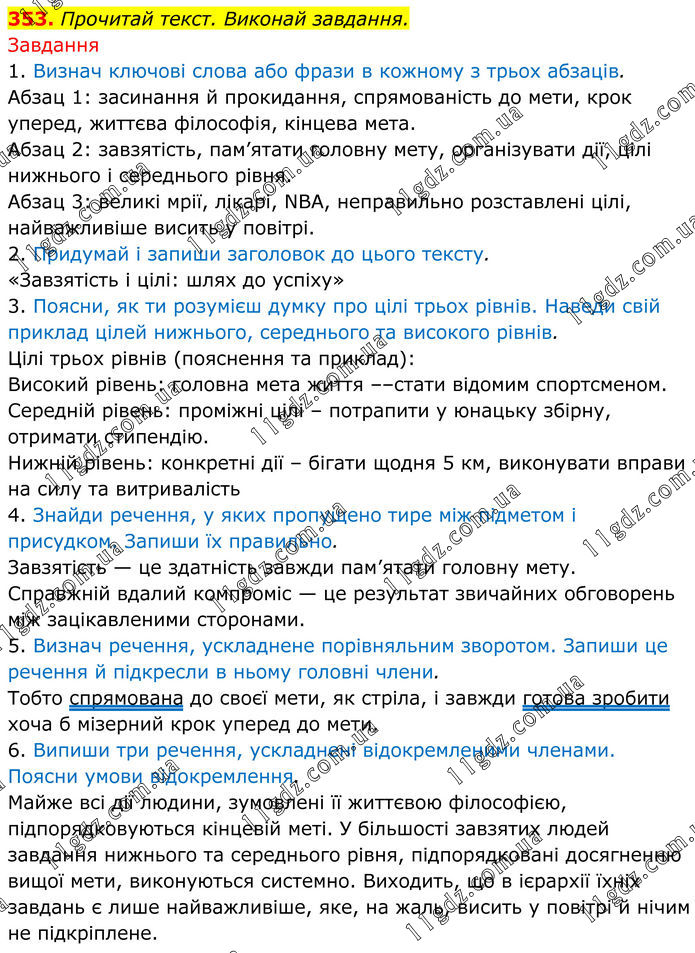 353. Прочитай текст. Виконай завдання. Завдання 1. Визнач ключові слова або фрази в кожному з трьох абзаців. Абзац 1: засинання й прокидання, спрямованість до мети, крок уперед, життєва філософія, кінцева мета. Абзац 2: завзятість, пам’ятати головну мету, організувати дії, цілі нижнього і середнього рівня. Абзац 3: великі мрії, лікарі, NBA, неправильно розставлені цілі, найважливіше висить у повітрі. 2. Придумай і запиши заголовок до цього тексту. «Завзятість і цілі: шлях до успіху» 3. Поясни, як ти розумієш думку про цілі трьох рівнів. Наведи свій приклад цілей нижнього, середнього та високого рівнів. Цілі трьох рівнів (пояснення та приклад): Високий рівень: головна мета життя ––стати відомим спортсменом. Середній рівень: проміжні цілі – потрапити у юнацьку збірну, отримати стипендію. Нижній рівень: конкретні дії – бігати щодня 5 км, виконувати вправи на силу та витривалість 4. Знайди речення, у яких пропущено тире між підметом і присудком. Запиши їх правильно. Завзятість — це здатність завжди пам’ятати головну мету. Справжній вдалий компроміс — це результат звичайних обговорень між зацікавленими сторонами. 5. Визнач речення, ускладнене порівняльним зворотом. Запиши це речення й підкресли в ньому головні члени. Тобто спрямована до своєї мети, як стріла, і завжди готова зробити хоча б мізерний крок уперед до мети. 6. Випиши три речення, ускладнені відокремленими членами. Поясни умови відокремлення. Майже всі дії людини, зумовлені її життєвою філософією, підпорядковуються кінцевій меті. У більшості завзятих людей завдання нижнього та середнього рівня, підпорядковані досягненню вищої мети, виконуються системно. Виходить, що в ієрархії їхніх завдань є лише найважливіше, яке, на жаль, висить у повітрі й нічим не підкріплене.