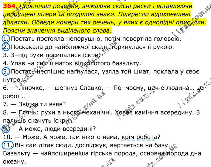 364. Перепиши речення, знімаючи скисні риски і вставляючи пропущені літери та розділові знаки. Підкресли відокремлені додатки. Обведи номери тих речень, у яких є однорідні присудки. Поясни значення виділеного слова. 1. Постать постояла непорушно, потім повертіла головою. 2. Поскакала до найближчої скелі, торкнулася її рукою. 3. З–під руки посипалися іскри. 4. Упав на сніг шматок відколотого базальту. 5. Постать неспішно нагнулася, узяла той шмат, поклала у своє нутро. 6. — Ліночко, — шепнув Славко. — По–моєму, це не людина… це робот… 7. — Звідки ти взяв? 8. — Глянь: рухи в нього механічні. Ховає каміння всередину. З пальців скачуть іскри… 9. — А може, люди всередині? 10. — Може. А може, там нікого нема, крім робота? 11. Він сам літає сюди, досліджує, вертається на базу. Базальту — найпоширеніша гірська порода, основна порода дна океану.