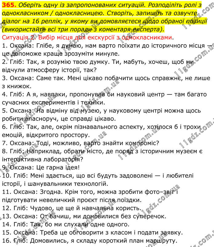 365. Оберіть одну із запропонованих ситуацій. Розподіліть ролі з однокласником / однокласницею. Створіть, запишіть та озвучте діалог на 16 реплік, у якому ви домовляєтеся щодо обраної позиції (використайте всі три поради з коментаря експерта). Ситуація 2. Вибір місця для екскурсії з однокласниками. 1. Оксана: Глібе, я думаю, нам варто поїхати до історичного місця — це допоможе краще зрозуміти минуле. 2. Гліб: Так, я розумію твою думку. Ти, мабуть, хочеш, щоб ми відчули атмосферу історії, так? 3. Оксана: Саме так. Мені цікаво побачити щось справжнє, не лише з книжок. 4. Гліб: А я, навпаки, пропонував би науковий центр — там багато сучасних експериментів і техніки. 5. Оксана: На відміну від музею, у науковому центрі можна щось робити власноруч, це справді цікаво. 6. Гліб: Так, але, окрім пізнавального аспекту, хотілося б і трохи емоцій, відкритого простору. 7. Оксана: Тоді, можливо, варто знайти компроміс? 8. Гліб: Наприклад, обрати місто, де поряд з історичним музеєм є інтерактивна лабораторія? 9. Оксана: Це гарна ідея! 10. Гліб: Мені здається, що всі будуть задоволені — і любителі історії, і шанувальники технологій. 11. Оксана: Згодна. Крім того, можна зробити фото–звіт і підготувати невеличкий проєкт після поїздки. 12. Гліб: Чудово, це ще й навчальна користь. 13. Оксана: От бачиш, ми домовилися без суперечок. 14. Гліб: Так, бо ми слухали одне одного. 15. Оксана: Треба це обговорити з класом і подати заявку. 16. Гліб: Домовились, я складу короткий план маршруту.