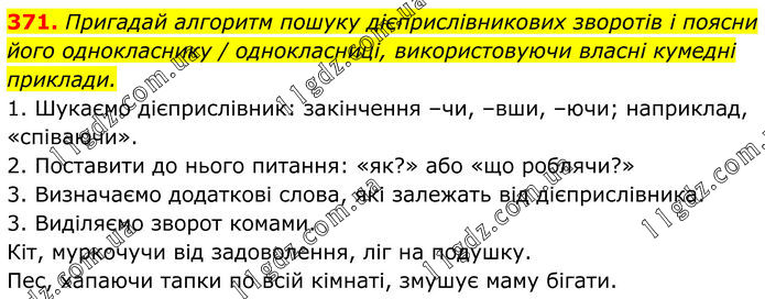 371. Пригадай алгоритм пошуку дієприслівникових зворотів і поясни його однокласнику / однокласниці, використовуючи власні кумедні приклади. 1. Шукаємо дієприслівник: закінчення –чи, –вши, –ючи; наприклад, «співаючи». 2. Поставити до нього питання: «як?» або «що роблячи?» 3. Визначаємо додаткові слова, які залежать від дієприслівника. 3. Виділяємо зворот комами. Кіт, муркочучи від задоволення, ліг на подушку. Пес, хапаючи тапки по всій кімнаті, змушує маму бігати.