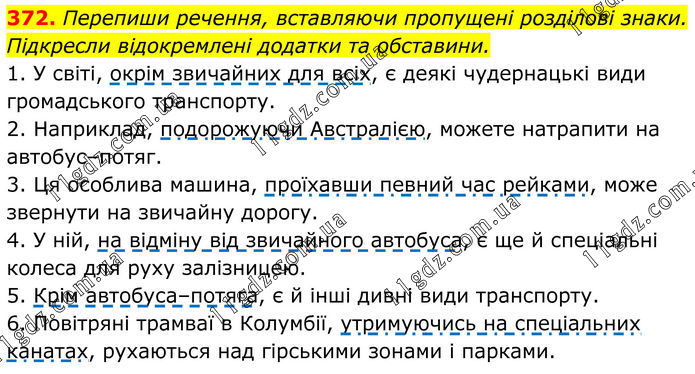 372. Перепиши речення, вставляючи пропущені розділові знаки. Підкресли відокремлені додатки та обставини. 1. У світі, окрім звичайних для всіх, є деякі чудернацькі види громадського транспорту. 2. Наприклад, подорожуючи Австралією, можете натрапити на автобус–потяг. 3. Ця особлива машина, проїхавши певний час рейками, може звернути на звичайну дорогу. 4. У ній, на відміну від звичайного автобуса, є ще й спеціальні колеса для руху залізницею. 5. Крім автобуса–потяга, є й інші дивні види транспорту. 6. Повітряні трамваї в Колумбії, утримуючись на спеціальних канатах, рухаються над гірськими зонами і парками.