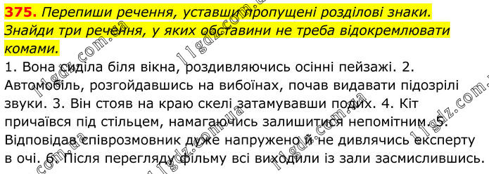 375. Перепиши речення, уставши пропущені розділові знаки. Знайди три речення, у яких обставини не треба відокремлювати комами. 1. Вона сиділа біля вікна, роздивляючись осінні пейзажі. 2. Автомобіль, розгойдавшись на вибоїнах, почав видавати підозрілі звуки. 3. Він стояв на краю скелі затамувавши подих. 4. Кіт причаївся під стільцем, намагаючись залишитися непомітним. 5. Відповідав співрозмовник дуже напружено й не дивлячись експерту в очі. 6. Після перегляду фільму всі виходили із зали засмислившись.