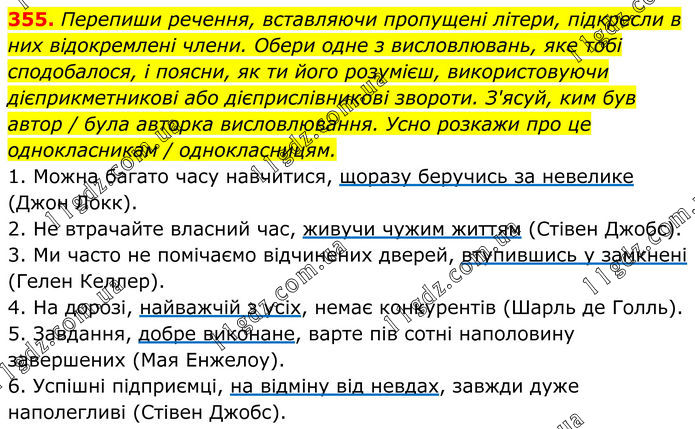 355. Перепиши речення, вставляючи пропущені літери, підкресли в них відокремлені члени. Обери одне з висловлювань, яке тобі сподобалося, і поясни, як ти його розумієш, використовуючи дієприкметникові або дієприслівникові звороти. З'ясуй, ким був автор / була авторка висловлювання. Усно розкажи про це однокласникам / однокласницям. 1. Можна багато часу навчитися, щоразу беручись за невелике (Джон Локк). 2. Не втрачайте власний час, живучи чужим життям (Стівен Джобс). 3. Ми часто не помічаємо відчинених дверей, втупившись у замкнені (Гелен Келлер). 4. На дорозі, найважчій з усіх, немає конкурентів (Шарль де Голль). 5. Завдання, добре виконане, варте пів сотні наполовину завершених (Мая Енжелоу). 6. Успішні підприємці, на відміну від невдах, завжди дуже наполегливі (Стівен Джобс).