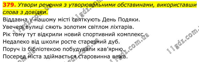 379. Утвори речення з утворювальними обставинами, використавши слова з довідки. Віддавна у нашому місті святкують День Подяки. Увечері вулиці сяють золотим світлом ліхтарів. Рік тому тут відкрили новий спортивний комплекс. Недалеко від школи росте старезний дуб. Поруч із бібліотекою побудували кав’ярню. Посеред міста здіймається старовинна вежа.