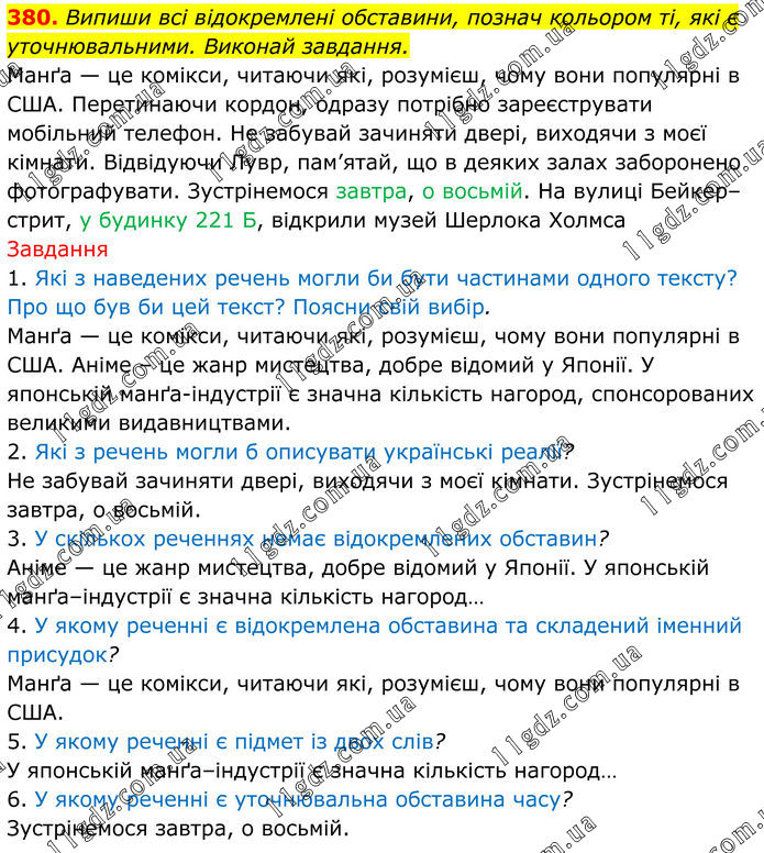 380. Випиши всі відокремлені обставини, познач кольором ті, які є уточнювальними. Виконай завдання. Манґа — це комікси, читаючи які, розумієш, чому вони популярні в США. Перетинаючи кордон, одразу потрібно зареєструвати мобільний телефон. Не забувай зачиняти двері, виходячи з моєї кімнати. Відвідуючи Лувр, пам’ятай, що в деяких залах заборонено фотографувати. Зустрінемося завтра, о восьмій. На вулиці Бейкер–стрит, у будинку 221 Б, відкрили музей Шерлока Холмса Завдання 1. Які з наведених речень могли би бути частинами одного тексту? Про що був би цей текст? Поясни свій вибір. Манґа — це комікси, читаючи які, розумієш, чому вони популярні в США. Аніме – це жанр мистецтва, добре відомий у Японії. У японській манґа-індустрії є значна кількість нагород, спонсорованих великими видавництвами. 2. Які з речень могли б описувати українські реалії? Не забувай зачиняти двері, виходячи з моєї кімнати. Зустрінемося завтра, о восьмій. 3. У скількох реченнях немає відокремлених обставин? Аніме — це жанр мистецтва, добре відомий у Японії. У японській манґа–індустрії є значна кількість нагород… 4. У якому реченні є відокремлена обставина та складений іменний присудок? Манґа — це комікси, читаючи які, розумієш, чому вони популярні в США. 5. У якому реченні є підмет із двох слів? У японській манґа–індустрії є значна кількість нагород… 6. У якому реченні є уточнювальна обставина часу? Зустрінемося завтра, о восьмій.