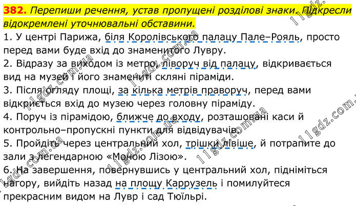 382. Перепиши речення, устав пропущені розділові знаки. Підкресли відокремлені уточнювальні обставини. 1. У центрі Парижа, біля Королівського палацу Пале–Рояль, просто перед вами буде вхід до знаменитого Лувру. 2. Відразу за виходом із метро, ліворуч від палацу, відкривається вид на музей і його знамениті скляні піраміди. 3. Після огляду площі, за кілька метрів праворуч, перед вами відкриється вхід до музею через головну піраміду. 4. Поруч із пірамідою, ближче до входу, розташовані каси й контрольно–пропускні пункти для відвідувачів. 5. Пройдіть через центральний хол, трішки лівіше, й потрапите до зали з легендарною «Моною Лізою». 6. На завершення, повернувшись у центральний хол, підніміться нагору, вийдіть назад на площу Каррузель і помилуйтеся прекрасним видом на Лувр і сад Тюїльрі.