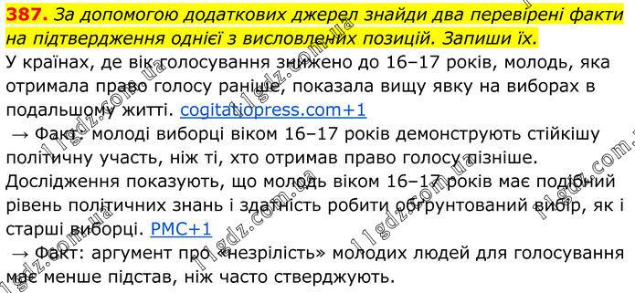 387. За допомогою додаткових джерел знайди два перевірені факти на підтвердження однієї з висловлених позицій. Запиши їх. У країнах, де вік голосування знижено до 16–17 років, молодь, яка отримала право голосу раніше, показала вищу явку на виборах в подальшому житті. cogitatiopress.com+1 → Факт: молоді виборці віком 16–17 років демонструють стійкішу політичну участь, ніж ті, хто отримав право голосу пізніше. Дослідження показують, що молодь віком 16–17 років має подібний рівень політичних знань і здатність робити обґрунтований вибір, як і старші виборці. PMC+1 → Факт: аргумент про «незрілість» молодих людей для голосування має менше підстав, ніж часто стверджують.