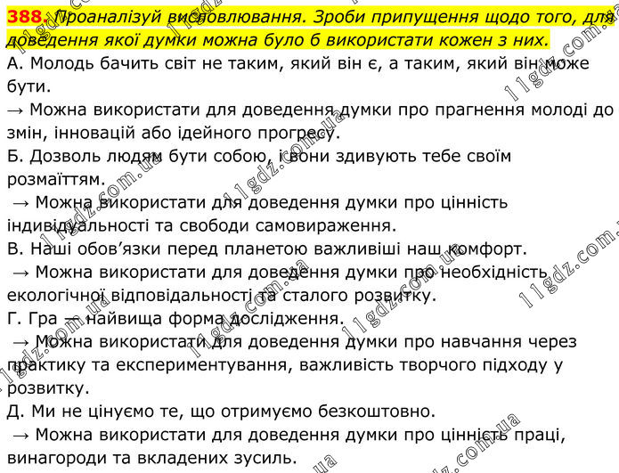 388. Проаналізуй висловлювання. Зроби припущення щодо того, для доведення якої думки можна було б використати кожен з них. А. Молодь бачить світ не таким, який він є, а таким, який він може бути. → Можна використати для доведення думки про прагнення молоді до змін, інновацій або ідейного прогресу. Б. Дозволь людям бути собою, і вони здивують тебе своїм розмаїттям. → Можна використати для доведення думки про цінність індивідуальності та свободи самовираження. В. Наші обов’язки перед планетою важливіші наш комфорт. → Можна використати для доведення думки про необхідність екологічної відповідальності та сталого розвитку. Г. Гра — найвища форма дослідження. → Можна використати для доведення думки про навчання через практику та експериментування, важливість творчого підходу у розвитку. Д. Ми не цінуємо те, що отримуємо безкоштовно. → Можна використати для доведення думки про цінність праці, винагороди та вкладених зусиль.