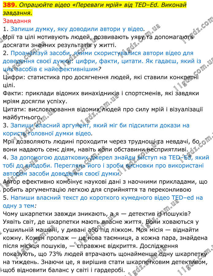 389. Опрацюйте відео «Переваги мрій» від ТЕD–Еd. Виконай завдання. Завдання 1. Запиши думку, яку доводили автори у відео. Мрії та цілі мотивують людей, розвивають уяву та допомагають досягати значних результатів у житті. 2. Проаналізуй засоби, якими скористувалися автори відео для доведення своєї думки: цифри, факти, цитати. Як гадаєш, який із цих засобів є найефективнішим? Цифри: статистика про досягнення людей, які ставили конкретні цілі. Факти: приклади відомих винахідників і спортсменів, які завдяки мріям досягли успіху. Цитати: висловлювання відомих людей про силу мрій і візуалізації майбутнього. 3. Запиши власний аргумент, який міг би підсилити докази на користь головної думки відео. Мрії дозволяють людині проходити через труднощі та невдачі, бо вони надають сенс діям, навіть коли обставини несприятливі. 4. За допомогою додаткових джерел знайди виступ на ТЕD–Ed, який тобі до вподоби. Переглянь його і зроби висновки про використані автором засоби доведення своєї думки. Автор ефективно комбінує наукові дані з наочними прикладами, що робить аргументацію легкою для сприйняття та переконливою 5. Напиши власний текст до короткого кумедного відео TED–ed на одну з тем: Чому шкарпетки завжди зникають, а я — детектив із пошуків? Уявіть світ, де шкарпетки мають власне життя. Вони ховаються у сушильній машині, у дивані або під ліжком. Моя місія — віднайти кожну. Кожен пропаж — це нова таємниця, а кожна пара, знайдена після місяця пошуків, — справжнє відкриття. Дослідження показують, що 73% людей втрачають щонайменше одну шкарпетку на тиждень. Знаючи це, я вирішив стати шкарпетковим детективом, щоб відновити баланс у світі і гардеробі.
