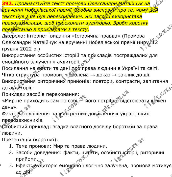 392. Проаналізуйте текст промови Олександри Матвійчук на врученні Нобелівської премії. Зробив висновки про те, чому цей текст був / не був переконливим. Які засоби використала правозахисниця, щоб переконати аудиторію. Зроби коротку презентацію з прикладами з тексту. Джерело: інтернет–видання «Історична правда» (Промова Олександри Матвійчук на врученні Нобелівської премії миру, 12 грудня 2022 р.) Використання особистих історій та прикладів постраждалих для емоційного залучення аудиторії. Посилання на факти та дані про права людини в Україні та світі. Чітка структура промови: проблема → доказ → заклик до дії. Використання риторичних прийомів: повтори, контрасти, запитання до аудиторії. Приклади засобів переконання: «Мир не приходить сам по собі — його потрібно відстоювати кожен день». Факт: Наголошення на конкретних досягненнях українських правозахисників. Особистий приклад: згадка власного досвіду боротьби за права людини. Презентація (коротко): 1. Тема промови: Мир та права людини. 2. Засоби доведення: факти, цитати, особисті історії, риторичні прийоми. 3. Ефект: аудиторія емоційно і логічно залучена, промова мотивує до дій.