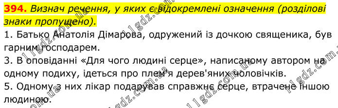 394. Визнач речення, у яких є відокремлені означення (розділові знаки пропущено). 1. Батько Анатолія Дімарова, одружений із дочкою священика, був гарним господарем. 3. В оповіданні «Для чого людині серце», написаному автором на одному подиху, ідеться про плем'я дерев'яних чоловічків. 5. Одному з них лікар подарував справжнє серце, втрачене іншою людиною.