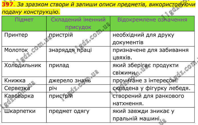 397. За зразком створи й запиши описи предметів, використовуючи подану конструкцію. Підмет Складений іменний присудок Відокремлене означення Принтер пристрій необхідний для друку документів Молоток знаряддя праці призначене для забивання цвяхів. Холодильник прилад який зберігає продукти свіжими. Книжка джерело знань прочитане з інтересом. Серветка річ складена у фігурку лебедя. Кавоварка пристрій створений для ранкового натхнення. Шкарпетки предмет одягу який завжди зникає у пральній машині.