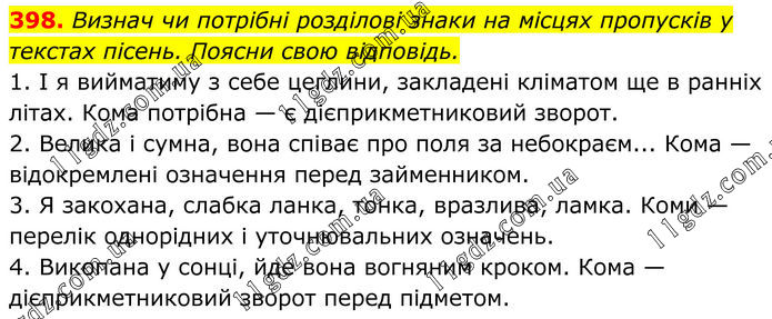 398. Визнач чи потрібні розділові знаки на місцях пропусків у текстах пісень. Поясни свою відповідь. 1. І я вийматиму з себе цеглини, закладені кліматом ще в ранніх літах. Кома потрібна — є дієприкметниковий зворот. 2. Велика і сумна, вона співає про поля за небокраєм... Кома — відокремлені означення перед займенником. 3. Я закохана, слабка ланка, тонка, вразлива, ламка. Коми — перелік однорідних і уточнювальних означень. 4. Викопана у сонці, йде вона вогняним кроком. Кома — дієприкметниковий зворот перед підметом.