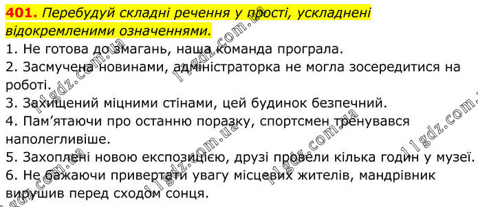 401. Перебудуй складні речення у прості, ускладнені відокремленими означеннями. 1. Не готова до змагань, наша команда програла. 2. Засмучена новинами, адміністраторка не могла зосередитися на роботі. 3. Захищений міцними стінами, цей будинок безпечний. 4. Пам’ятаючи про останню поразку, спортсмен тренувався наполегливіше. 5. Захоплені новою експозицією, друзі провели кілька годин у музеї. 6. Не бажаючи привертати увагу місцевих жителів, мандрівник вирушив перед сходом сонця.