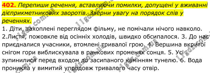 402. Перепиши речення, вставляючи помилки, допущені у вживанні дієприкметникових зворотів. Зверни увагу на порядок слів у реченнях. 1. Діти, захоплені переглядом фільму, не помічали нічого навколо. 2.Листя, пожовкле від осінніх холодів, швидко обсипалося. 3. До нас приєдналися учасники, втомлені тривалої грою. 4. Вершина вкритої снігом гори виблискувала в ранкових променях сонця. 5. Усі зупинилися перед входом до засипаного камінням тунелю. 6. Вода проникла у вимитий упродовж тривалого часу отвір.