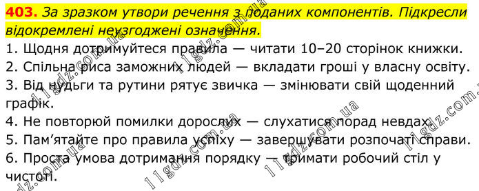 403. За зразком утвори речення з поданих компонентів. Підкресли відокремлені неузгоджені означення. 1. Щодня дотримуйтеся правила — читати 10–20 сторінок книжки. 2. Спільна риса заможних людей — вкладати гроші у власну освіту. 3. Від нудьги та рутини рятує звичка — змінювати свій щоденний графік. 4. Не повторюй помилки дорослих — слухатися порад невдах. 5. Пам’ятайте про правила успіху — завершувати розпочаті справи. 6. Проста умова дотримання порядку — тримати робочий стіл у чистоті.