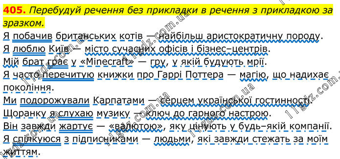 405. Перебудуй речення без прикладки в речення з прикладкою за зразком. Я побачив британських котів — найбільш аристократичну породу. Я люблю Київ — місто сучасних офісів і бізнес–центрів. Мій брат грає у «Minecraft» — гру, у якій будують мрії. Я часто перечитую книжки про Гаррі Поттера — магію, що надихає покоління. Ми подорожували Карпатами — серцем української гостинності. Щоранку я слухаю музику — ключ до гарного настрою. Він завжди жартує — «валютою», яку цінують у будь–якій компанії. Я спілкуюся з підписниками — людьми, які завжди стежать за моїм життям.