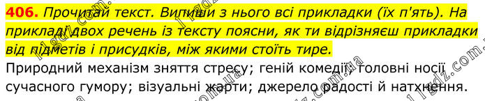 406. Прочитай текст. Випиши з нього всі прикладки (їх п'ять). На прикладі двох речень із тексту поясни, як ти відрізняєш прикладки від підметів і присудків, між якими стоїть тире. Природний механізм зняття стресу; геній комедії; головні носії сучасного гумору; візуальні жарти; джерело радості й натхнення.