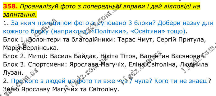 358. Проаналізуй фото з попередньої вправи і дай відповіді на запитання. 1. За яким принципом фото згруповано 3 блоки? Добери назву для кожного блоку (наприклад, «Політики», «Освітяни» тощо). Блок 1. Волонтери та благодійники: Тарас Чмут, Сергій Притула, Марія Берлінська. Блок 2. Митці: Василь Байдак, Нікіта Тітов, Валентин Васянович. Блок 3. Спортсмени: Ярослава Магучіх, Еліна Світоліна, Людмила Лузан. 2. Про кого з людей на фото ти вже чув / чула? Кого ти не знаєш? Знаю Ярославу Магучих та Світоліну.