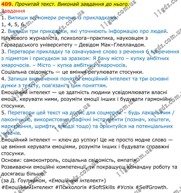 409. Прочитай текст. Виконай завдання до нього. Завдання 1. Випиши всі номери речень із прикладками. 1, 4, 5, 6. 2. Випиши три прикладки, які уточнюють інформацію про людей. Наукового журналіста, психолога–практика, науковцем з Гарвардського університету – Девідом Мак–Глелландом. 3. Перетвори прикладку та означуване слово з речення 6 на речення з підметом і присудком за зразком: Я бачу місто – купку амбітних хмарочосів. – Місто – купка амбітних хмарочосів. Соціальна свідомість — це вміння регулювати стосунки. 4. Запиши визначення поняття емоційний інтелект та три основні думки з тексту, пов'язані з цим поняттям. Емоційний інтелект — це здатність людини усвідомлювати власні емоції, керувати ними, розуміти емоції інших і будувати гармонійні стосунки. 5. Перетвори цей текст на допис для соцмереж – будь лаконічним / лаконічною, використовує графічні інструменти (познач, хештеги, маркування, шрифти, емодзі тощо) та орієнтуйся на потенціальних читачів. Емоційний інтелект — ключ до успіху! Це не просто модне слово — це вміння керувати емоціями, розуміти інших і будувати справжні стосунки. Основи: самоконтроль, соціальна свідомість, емпатія. Розвиваючи емоційні компетенції, ти покращуєш командну роботу та досягаєш більше. (за Д. Ґоулманом, «Емоційний інтелект») #ЕмоційнийІнтелект #Психологія #SoftSkills #Успіх #SelfGrowth.
